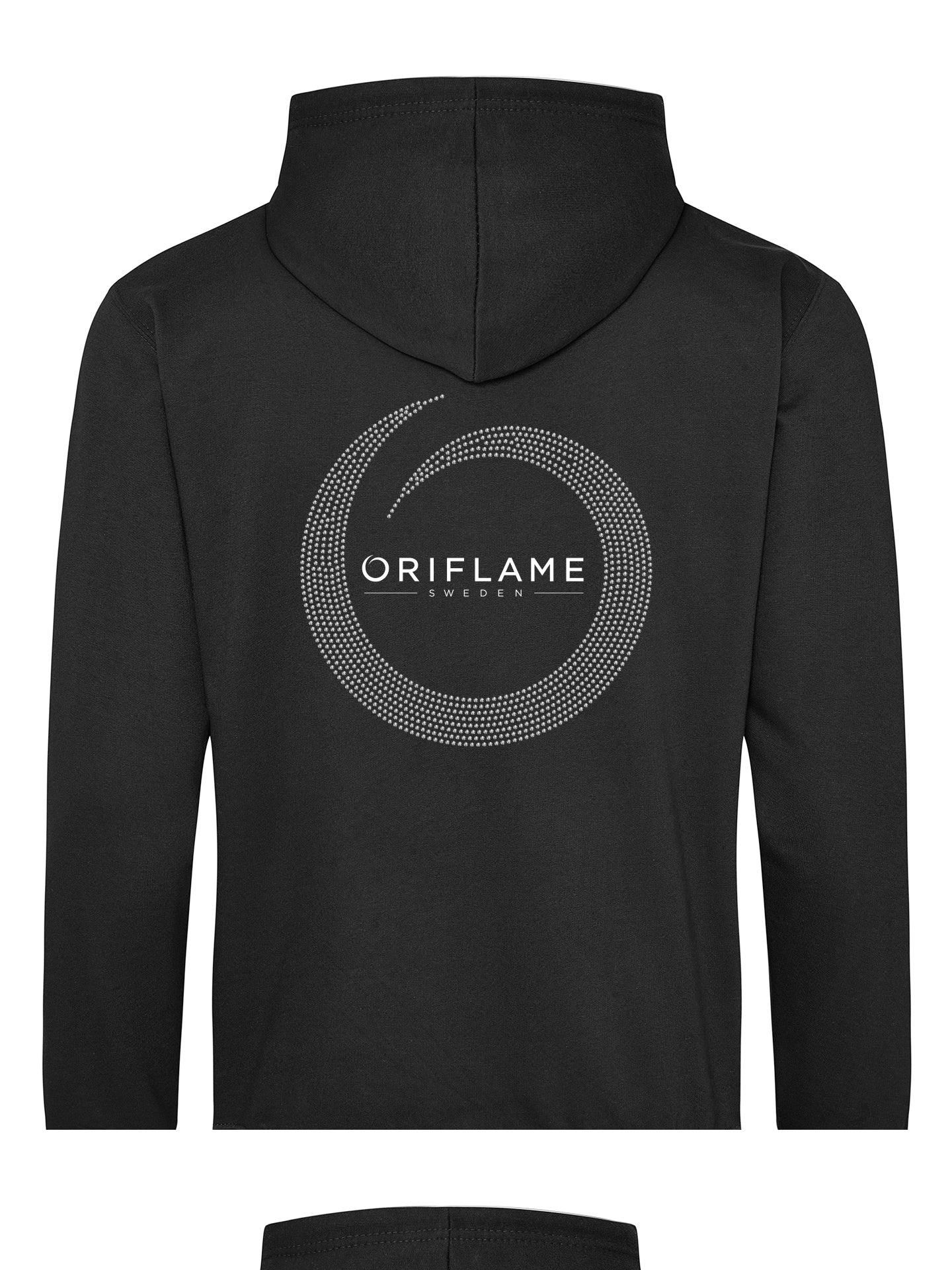 Oriflame Zipped Hoodie with Clear Rhinestones. Featuring an eye-catching rhinestone logo on the back and front, this hoodie is both stylish and functional. The perfect addition to your wardrobe for a touch of glamour.